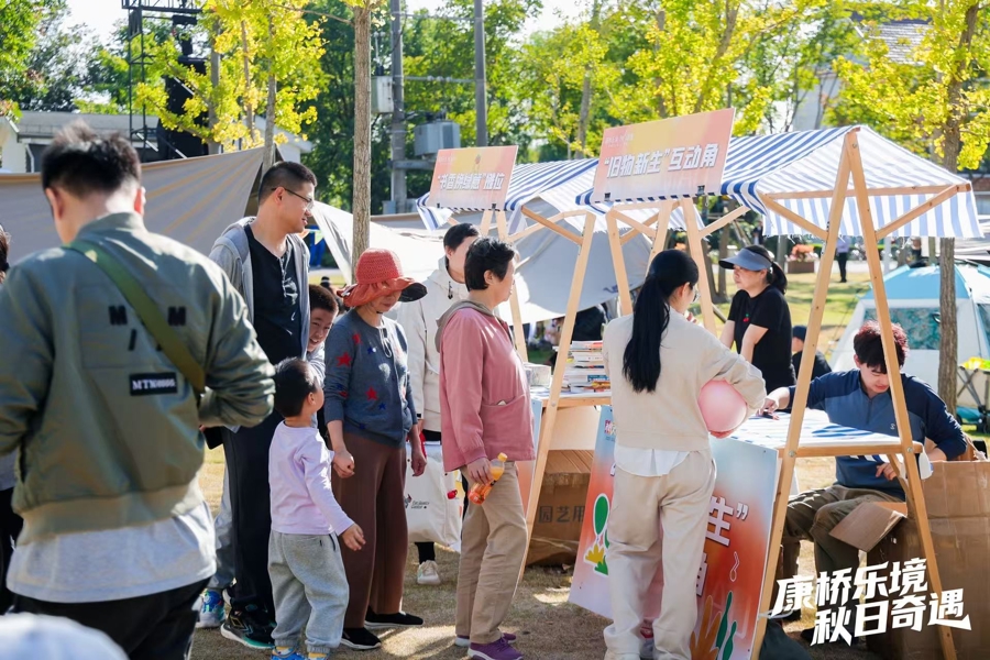 “绿色环保”是本次音乐节的另一重底色。在以旧“焕”新摊位前,居民们提着旧书有序排队,符合标准的书籍可兑换健康轻食、有机蔬菜或小绿植。“家里旧书堆着占地方,换份绿植还能支持环保,一举两得!”居民王先生兑换完轻食,又带着孩子在“旧物新生”互动角体验DIY环保草编包制作。据了解,本次收集的500余册旧书将捐赠给延边学校,而活动产生的所有垃圾则通过分类处理纳入康桥镇“滨河慢行系统”的生态循环体系。从御叶路滨河绿地的口袋公园到百曲港童悦空间的亲水平台,生态理念正通过这类互动实践融入居民日常。